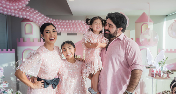 Ao lado da esposa, Gaby Menotti, e da filha mais velha, Juju, o artista optou por uma festa intimista, com proposta delicada e personalizada. O tema escolhido foi “chá da tarde”, que trouxe uma decoração em tons de rosa claro, mesa posta e um clima elegante e aconchegante.