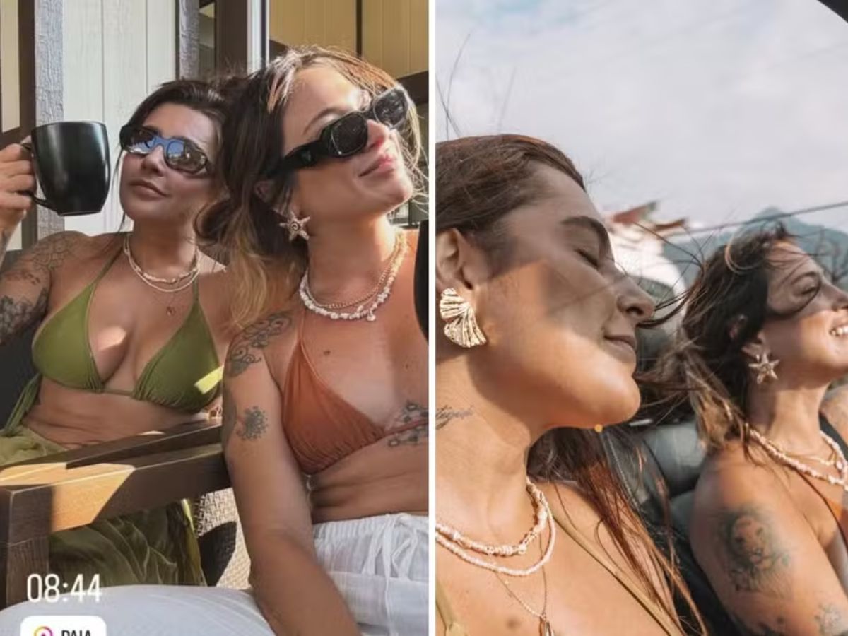 Em uma das imagens, Lauana surge sorridente pendurada em uma árvore à beira-mar, enquanto Tati captura o cenário com o pôr do sol ao fundo. Em outro clique, as duas aparecem abraçadas diante do oceano, celebrando o amor e a parceria entre elas.