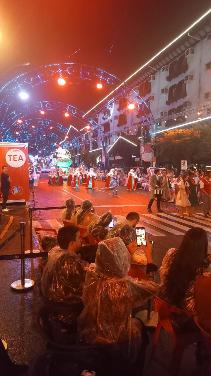 A tradicional Avenida das Hortênsias ficou completamente tomada pelo público, que se reuniu para assistir à passagem dos carros alegóricos, repletos de cores, luzes e detalhes encantadores. O desfile transformou o espaço urbano em um verdadeiro palco a céu aberto, criando uma atmosfera de alegria, emoção e espírito natalino.