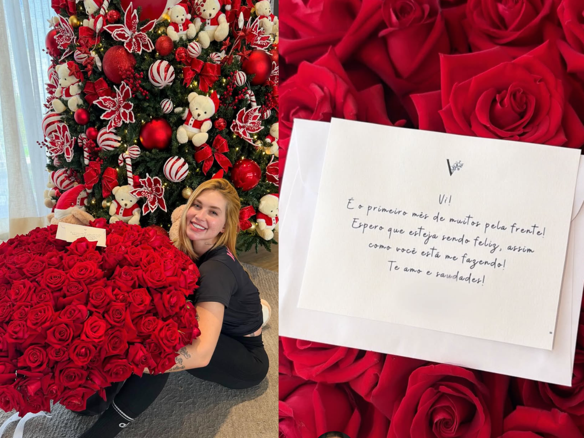 Sorridente, Virginia posou com as flores e revelou que o mimo veio acompanhado de uma mensagem carinhosa escrita pelo craque. No bilhete, Vini destacou o quanto está feliz com o relacionamento e o quanto deseja que essa nova fase continue por muito tempo. “Que seja apenas o começo. Você me faz muito feliz. Te amo”, escreveu ele.