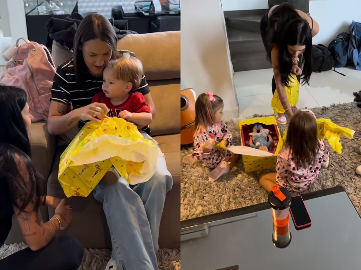 Zé Felipe encantou os seguidores nesta terça-feira (21/10) ao compartilhar um vídeo mostrando Ana Castela presenteando seus filhos, Maria Alice, Maria Flor e José Leonardo, frutos de seu relacionamento com Virginia Fonseca. Nos registros, é possível ver a cantora interagindo de forma afetuosa com as crianças, entregando brinquedos e ajudando-as a abrir os embrulhos.